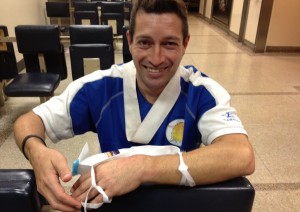 Mais j’aimerais revenir à la semaine passée, et offrir a Luis Cortes mes sympathies pour son bras cassé en glissant au 2e but. J’ai compris qu’il a même demandé poliment un time out, alors que son bras pendouillait ??? Quelle classe… Malgré la tragédie, Luis nous offre un beau sourire directement de l’hôpital, accompagné de Joel. ( voyez la photo ci-jointe )